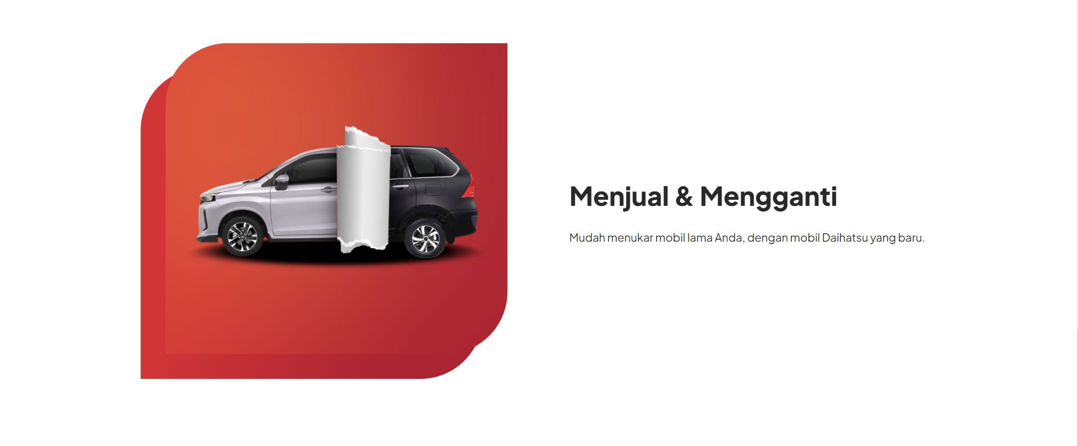 Mudah menukar mobil lama Anda, dengan mobil Daihatsu yang baru. Program tukar tambah Daihatsu memudahkan Anda untuk memiliki mobil baru. Dengan program tukar tambah, Anda bisa menukarkan mobil lama Anda dengan mobil Daihatsu baru. Prosesnya cepat dan mudah, tanpa perlu repot mencari pembeli untuk mobil lama Anda.